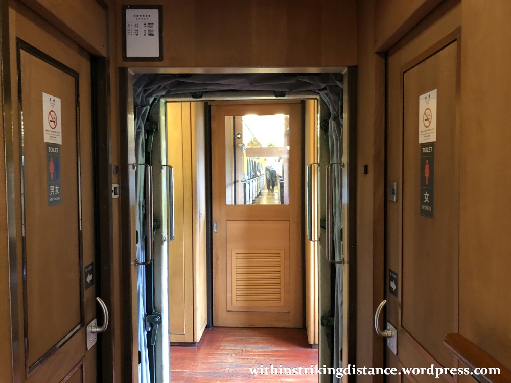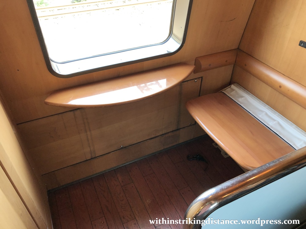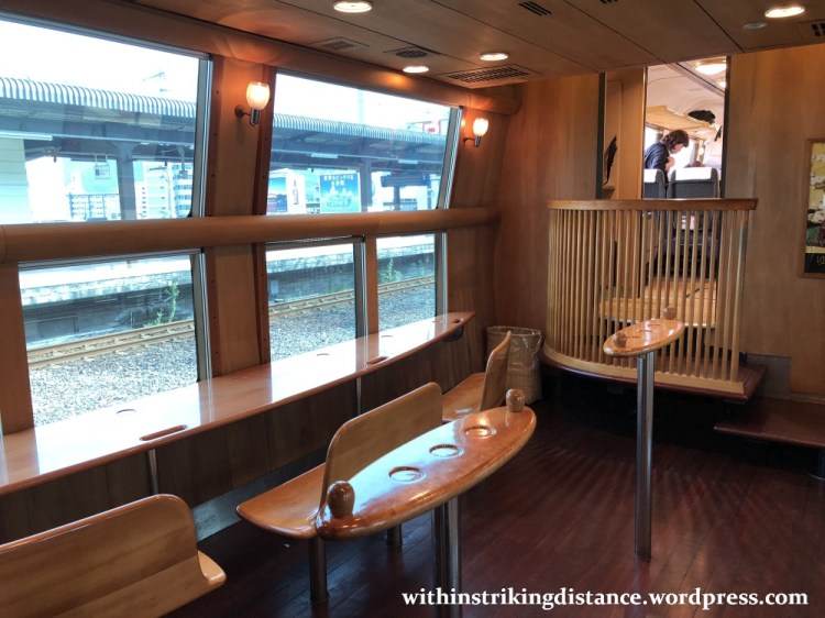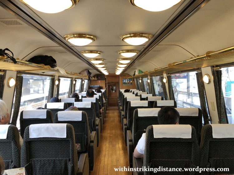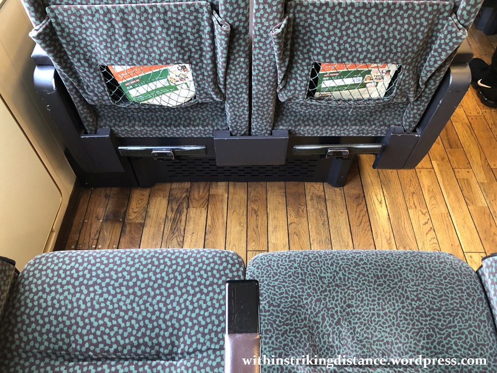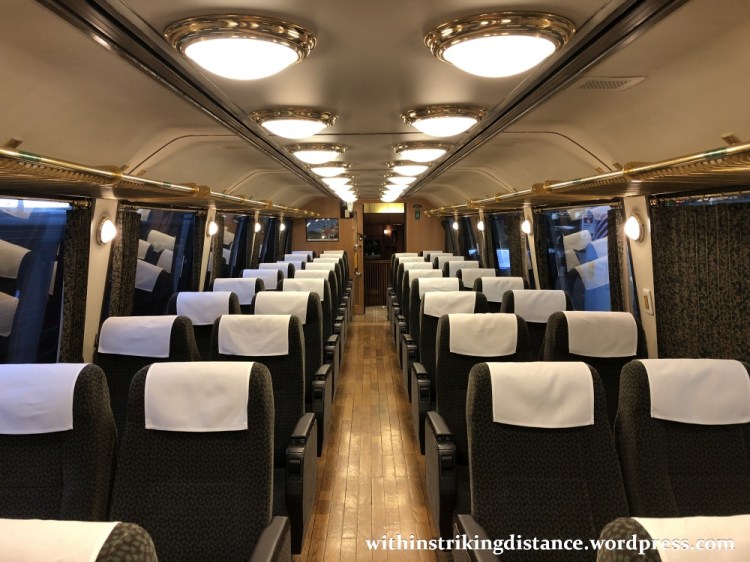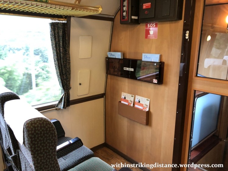 And here’s my assigned compartment, in Car 3. The seats are fairly typical of long-distance Japanese limited express trains, but the decorative accents – brass luggage racks, metal-framed lighting, patterned curtains, polished wooden floors – add a touch of luxury and old-fashioned charm that one won’t find on an ordinary commuter service.