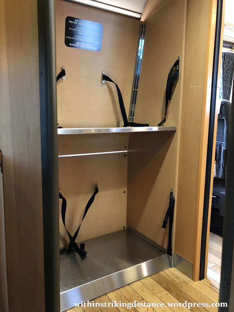 The area near the doors is equipped with the usual facilities: toilets, multi-purpose room, and a small sitting area (used as luggage space with the bench folded up).