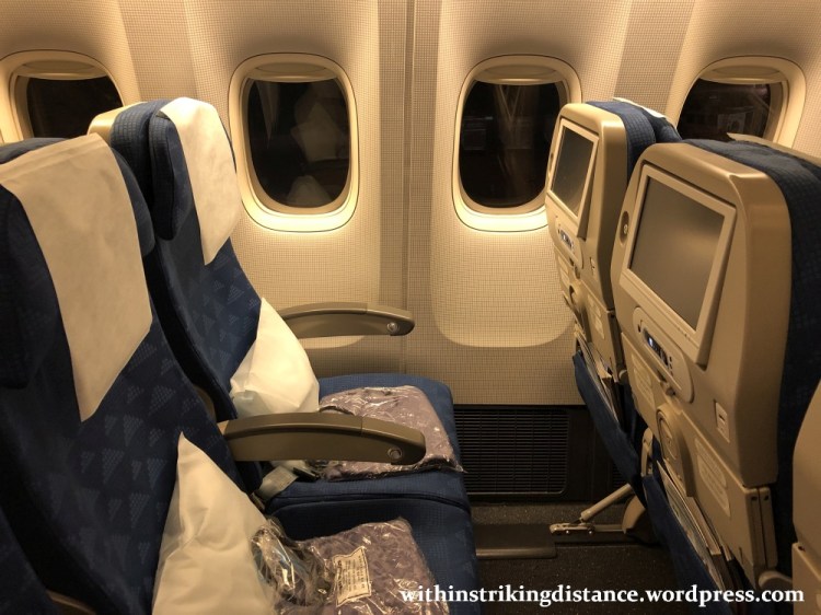The Economy aerobridge fed us through HL7573’s second port-side door, just forward of the last two Prestige Class rows, thereby denying me the chance to peek into the small First Class cabin near the nose. Based on information from the KE website, that part of the plane has a single row comprised of six “Sleeper” seats in three pairs. Each seat has 83 inches of pitch and 20.1 inches of width, can lie flat at 180 degrees, and is fitted with a 17-inch personal IFE monitor.