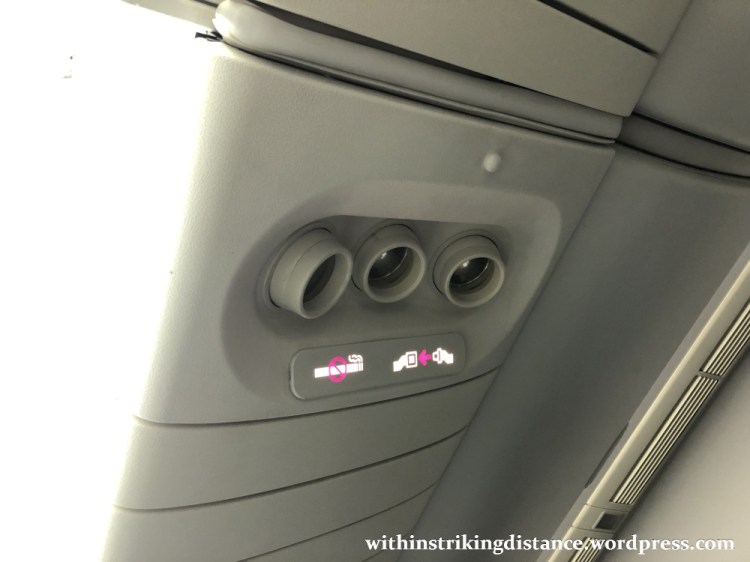 Quite decent exterior views, with wing intrusion easily avoided by angling one’s camera a bit back. At least, the views would have been quite decent if this were a daytime flight. Given that the sun had long retired for the evening by the time we took off, there was nothing visible outside after we’d reached cruising altitude.