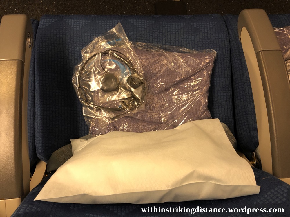 Pillows, blankets, and headphones were laid out on each seat ahead of boarding. Interestingly enough, the headphones required some minor assembly. The foam earpiece covers were packed in a little plastic bag of their own and I had to slip them into place before use.