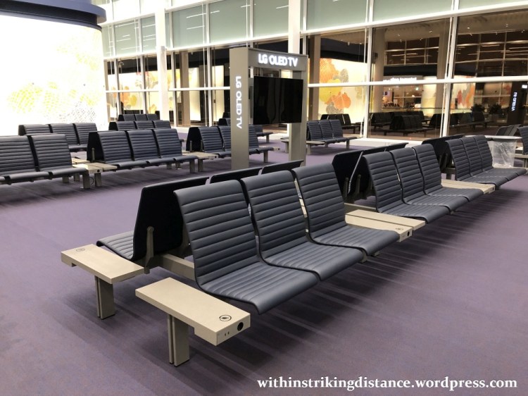 There’s a good variety of seating options in T2 if one knows where to look, especially up in the Transfer Lounge. Down near the boarding gates, it’s a fairly uniform array of cushioned airport benches. (Note the USB charging ports and Korean-style power outlet.)