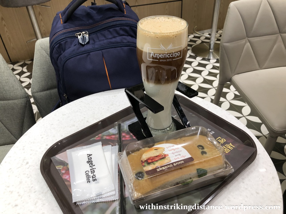 Now for a simple café breakfast – my first meal on the ground for this Korean holiday. On the tray: a mozzarella focaccia sandwich (5,800 won) and some frothy iced Americcino (6,000 won), at Angel-in-us Coffee.