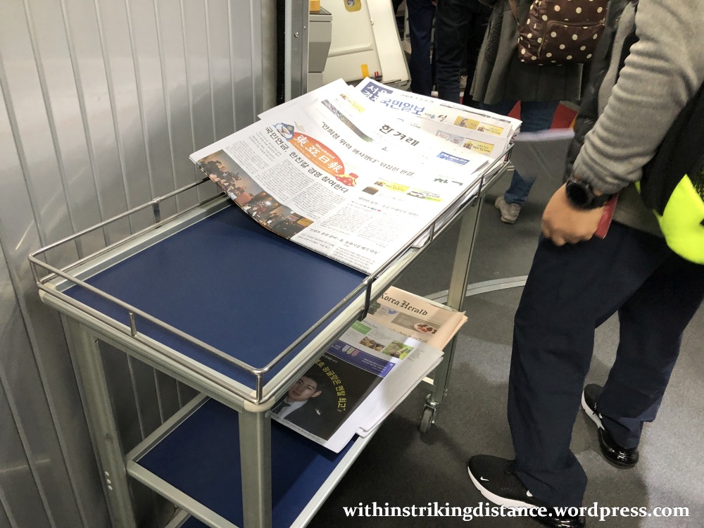 Newspapers were laid out on a cart in the aerobridge at ICN, allowing passengers to help themselves as they walked towards the plane.