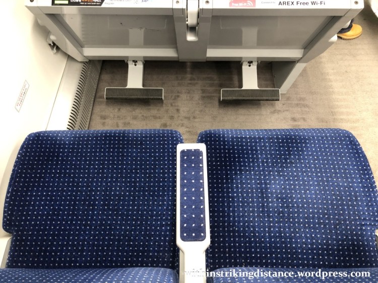 Unlike the A’REX 2000 Series EMU rolling stock used on the All-Stop service – which were designed as normal commuter trains with bench-style seats and limited luggage space – the A’REX 1000 Series EMU employed for the Express has all the equipment one would expect to see on an airport train. There are dedicated luggage racks near the doors…