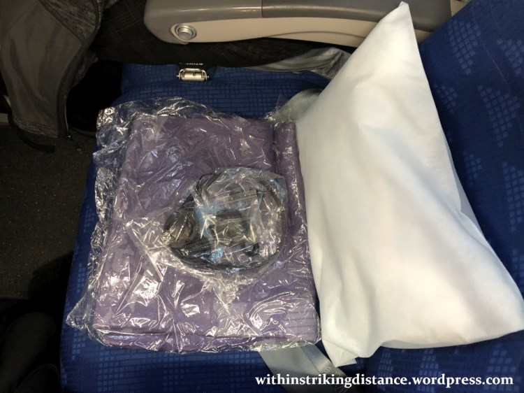 Pillows, blankets, and headphones were laid out on each seat ahead of boarding. Interestingly, the headphones required some minor assembly. The foam earpiece covers were packed in a little plastic bag of their own and I had to slip them into place myself.