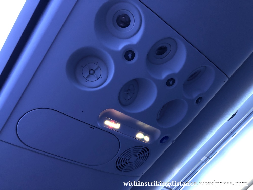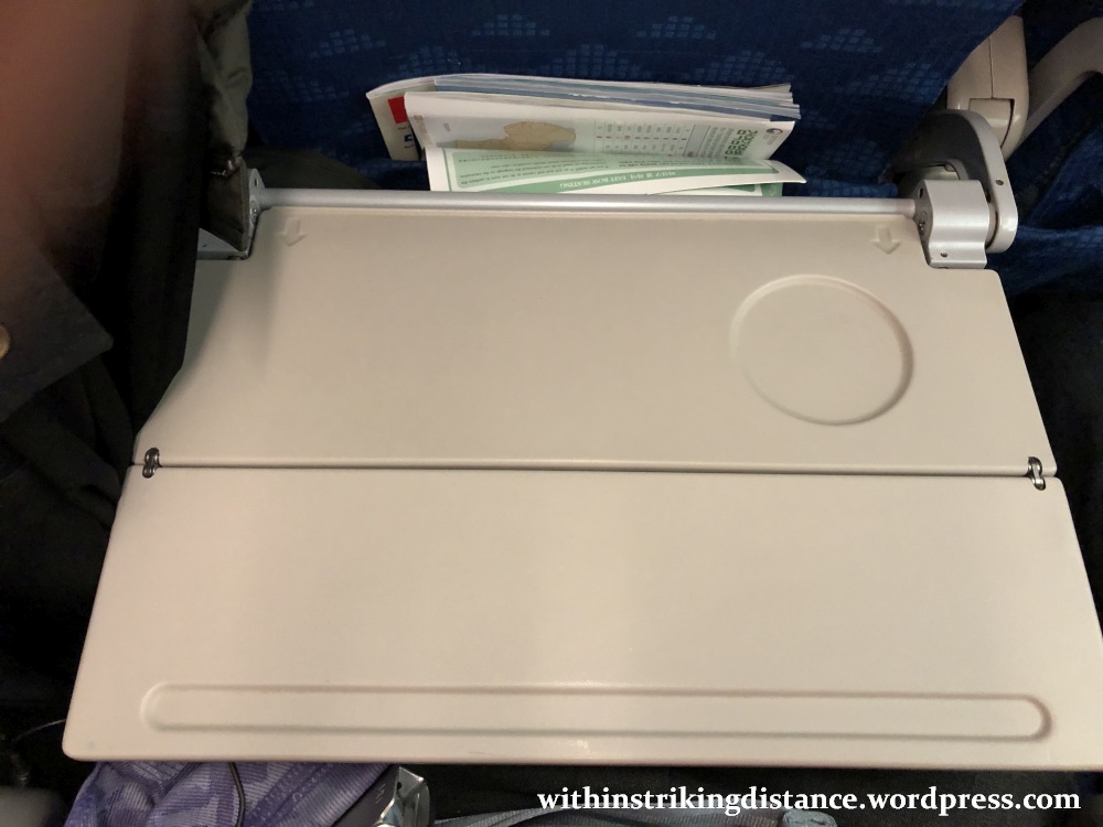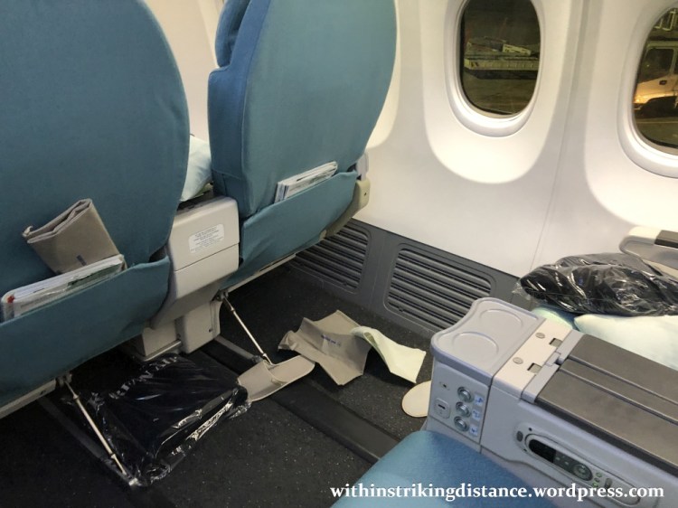 The first picture below was taken after landing, hence the used pillow and blanket. Don’t take this as a sign of shoddy pre-departure housekeeping on KE’s part!