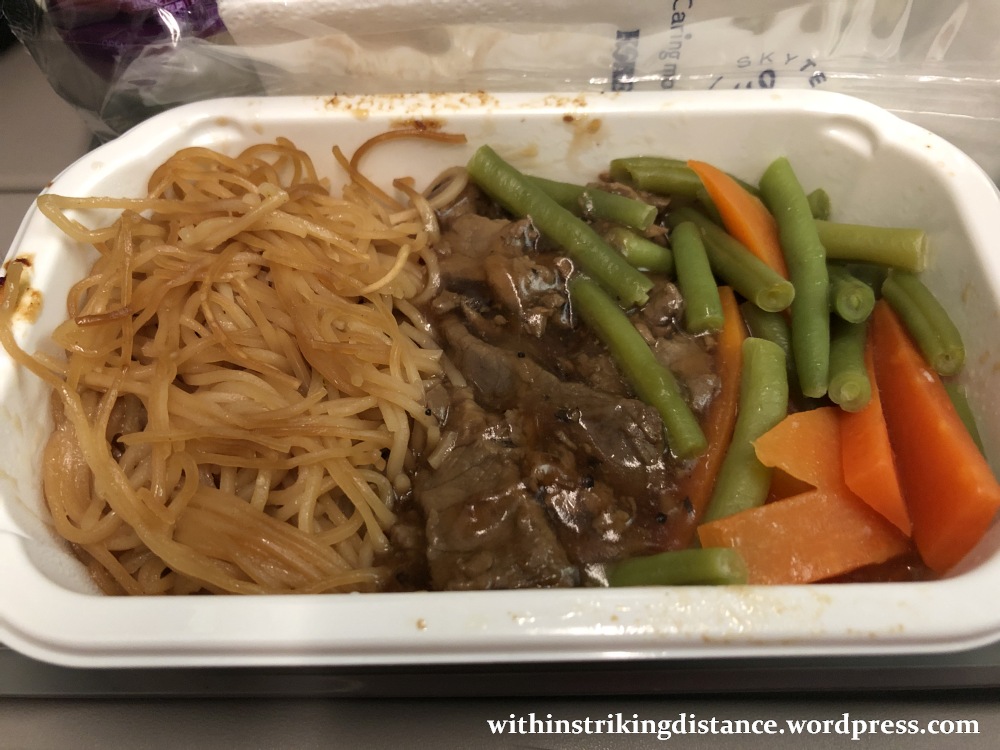 Two meal options were offered in Economy Class: a rice dish with either chicken or seafood (can’t quite recall which), and a noodle dish with beef. Red meat trumps white in my book, so beef it was.