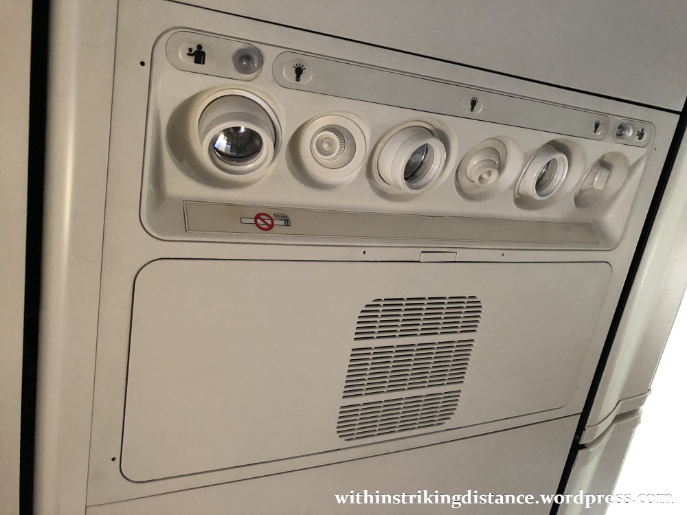 The overhead panel seemed a little old-fashioned in terms of the layout and iconography. Due to the lack of built-in PTVs for the IFE system, the attendant call buttons and reading lamp switches were all mounted on the panel (rather than on, say, the PTV remote control).