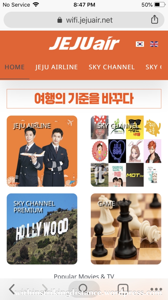 As one might expect from an LCC, 7C’s aeroplanes aren’t fitted with personal TV monitors. That said, international flights departing from ICN feature a simple on-board IFE system that broadcasts content directly to passengers’ devices. Detailed instructions are set out in the in-flight magazine, but in brief, a passenger simply needs to connect to the on-board WiFi network and load the dedicated IFE homepage to get started. (Note that the on-board WiFi doesn’t offer Internet access; it’s used only for the IFE system.) There’s no need to download/install a special app before take-off in order to stream content during the flight.