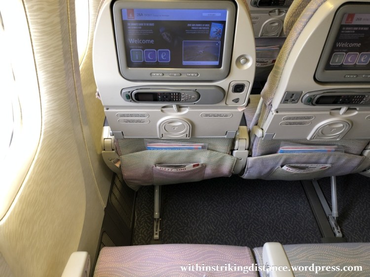 A small rubbish bag, a printed guide for the in-flight entertainment system, a duty free catalogue, a donation envelope for EK’s in-house charity, and a safety briefing card. Except for the safety card in its own little pocket, everything was inserted into a plastic sleeve before being tucked in – a nice touch as this kept the items organised even with me repeatedly shoving in or pulling out other objects that I wanted to keep in the larger pocket.