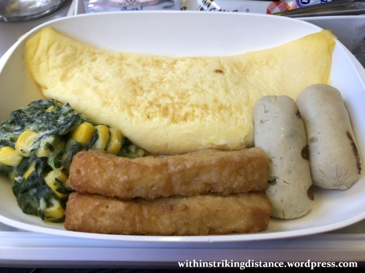 This was an improvement over the omelette we were served on the previous flight, thanks to the inclusion of flavourful sausages and filling hash browns. I was also delighted to have more than the usual dose of bread on my tray, with some flatbread in addition to the standard breakfast croissant.