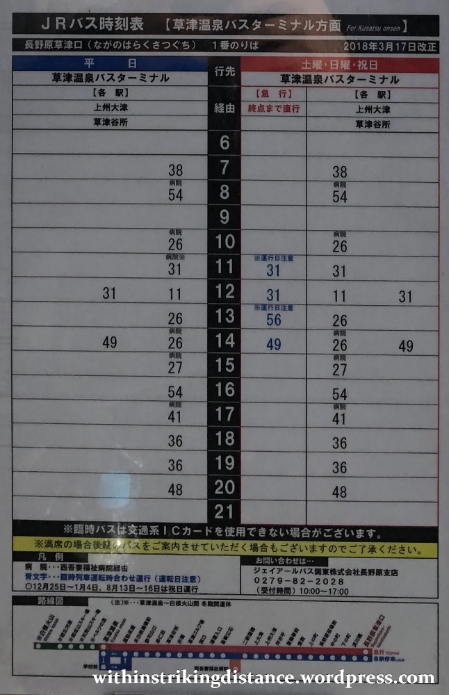 These are the timetables posted at Kusatsu Onsen’s bus terminal for the return journey to Naganohara-Kusatsuguchi. Note how each service is timed to coincide with onward train departures from the JR station.