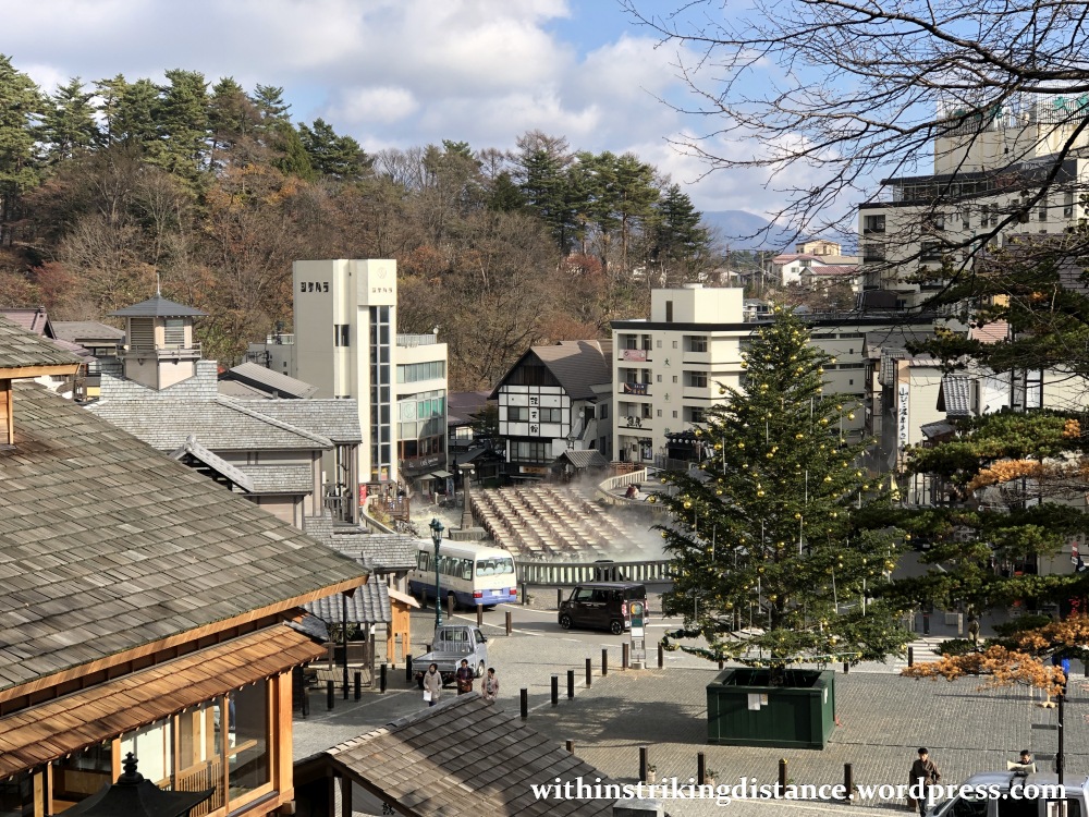 My steps took me past a hillside temple, in front of which was a gate with steps leading down to the main square. This gave me an elevated vantage point from which to observe the beating heart of Kusatsu Onsen…