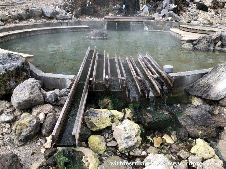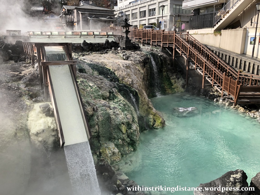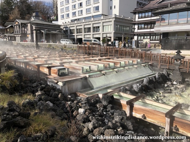…the iconic Yubatake (湯畑). This rather ingenious construction funnels Kusatsu’s scalding-hot spring water – which emerges from the ground in excess of 70 C – down a series of open wooden channels, allowing the cool mountain air to disperse excess heat. The water then cascades into a rock-lined collecting pool, and eventually through pipes for distribution amongst the town’s bathing facilities.
