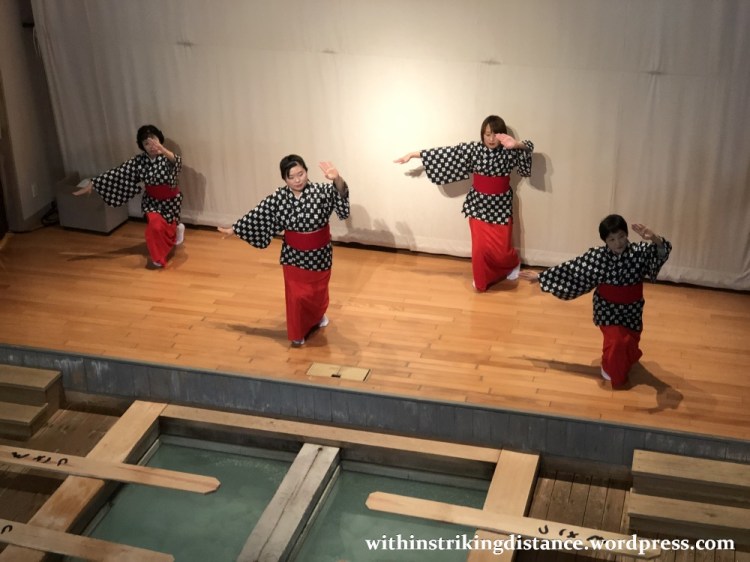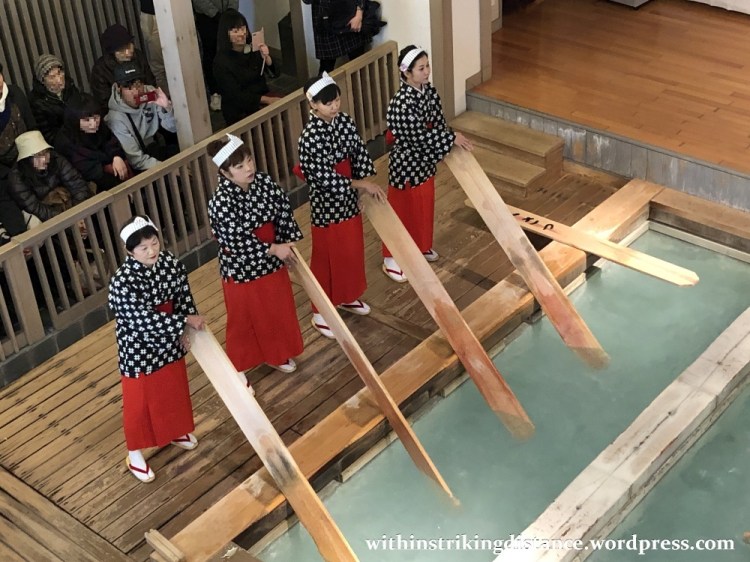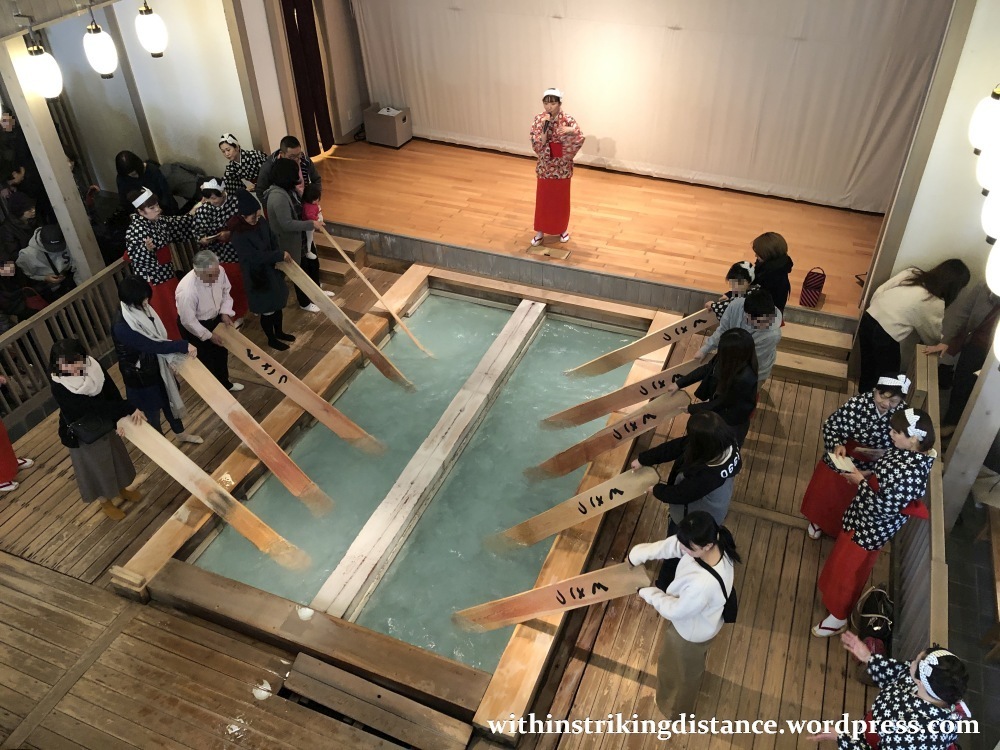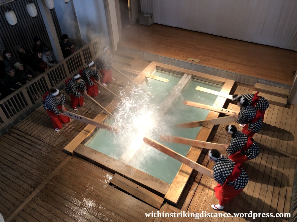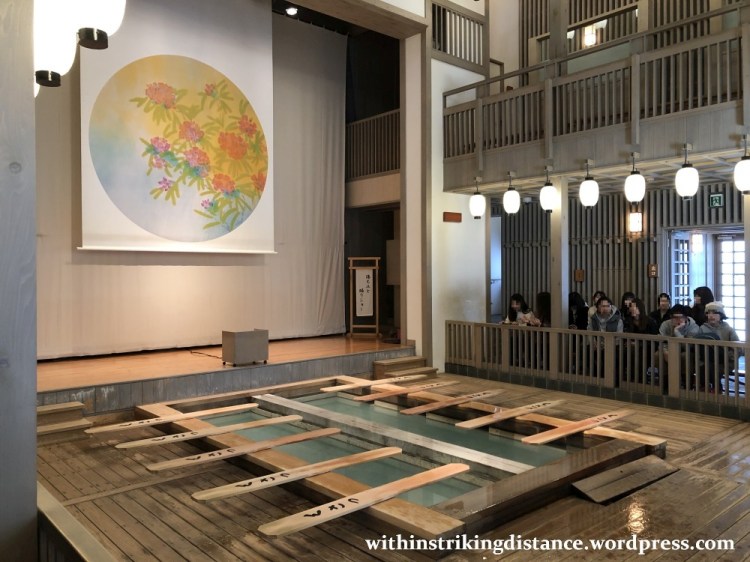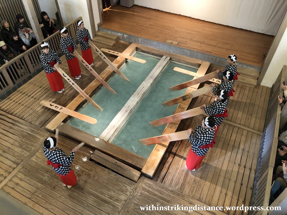 …and a lovely setting for regular performances of Yumomi (湯もみ). This is an old technique for cooling down freshly sourced hot spring water to a safe temperature, developed as an alternative to adding cold water (which might dilute the natural product’s therapeutic properties). The labour-intensive process involves some vigorous stirring and beating with long wooden paddles, the actions timed to match the rhythmic beats of a wooden clapper and accompanied by traditional songs.