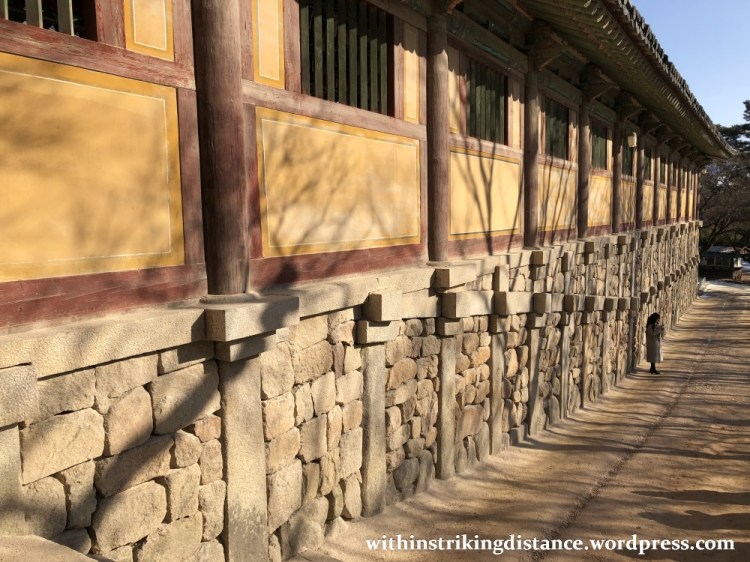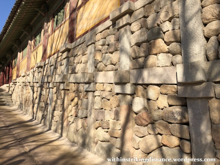 Sadly, Angry Usagi had to bid his new boar friend farewell as I left the courtyard and began making my way down a sloping road. This path runs alongside the retaining wall built to support the raised terrace on which Geugnakjeon stands. Take a moment to appreciate the complex arrangement of stone beams and columns that the ancient architects employed to reconcile the flat platform above and the angled ground underneath.