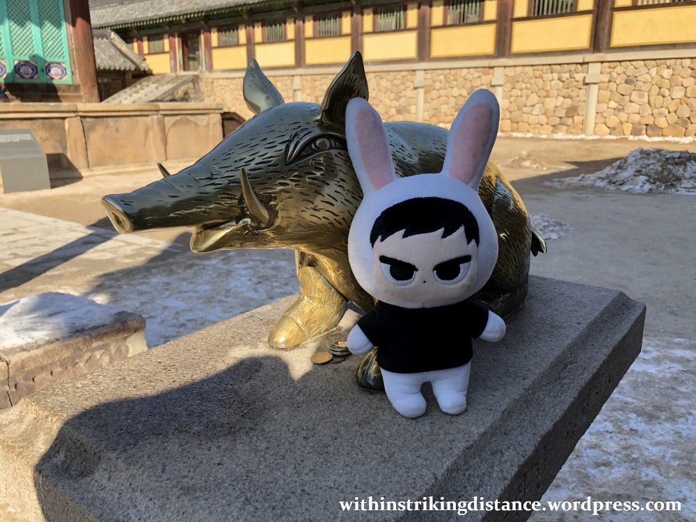 Sadly, Angry Usagi had to bid his new boar friend farewell as I left the courtyard and began making my way down a sloping road. This path runs alongside the retaining wall built to support the raised terrace on which Geugnakjeon stands. Take a moment to appreciate the complex arrangement of stone beams and columns that the ancient architects employed to reconcile the flat platform above and the angled ground underneath.