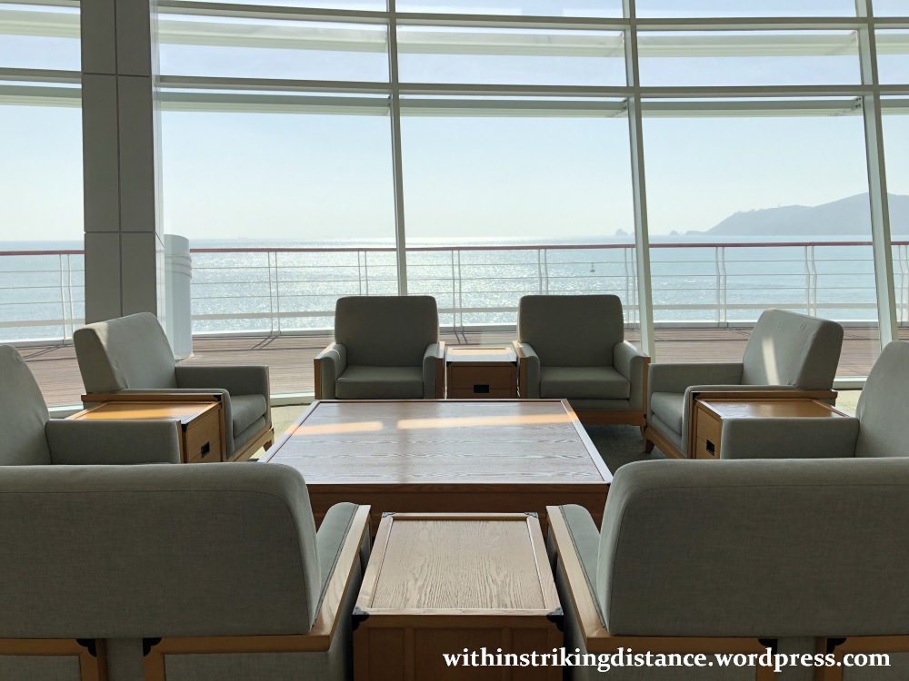 The elegant lounge space set up for the visiting leaders is fitted with massive plate-glass windows, offering fantastic views of the sea outside and islands far beyond.