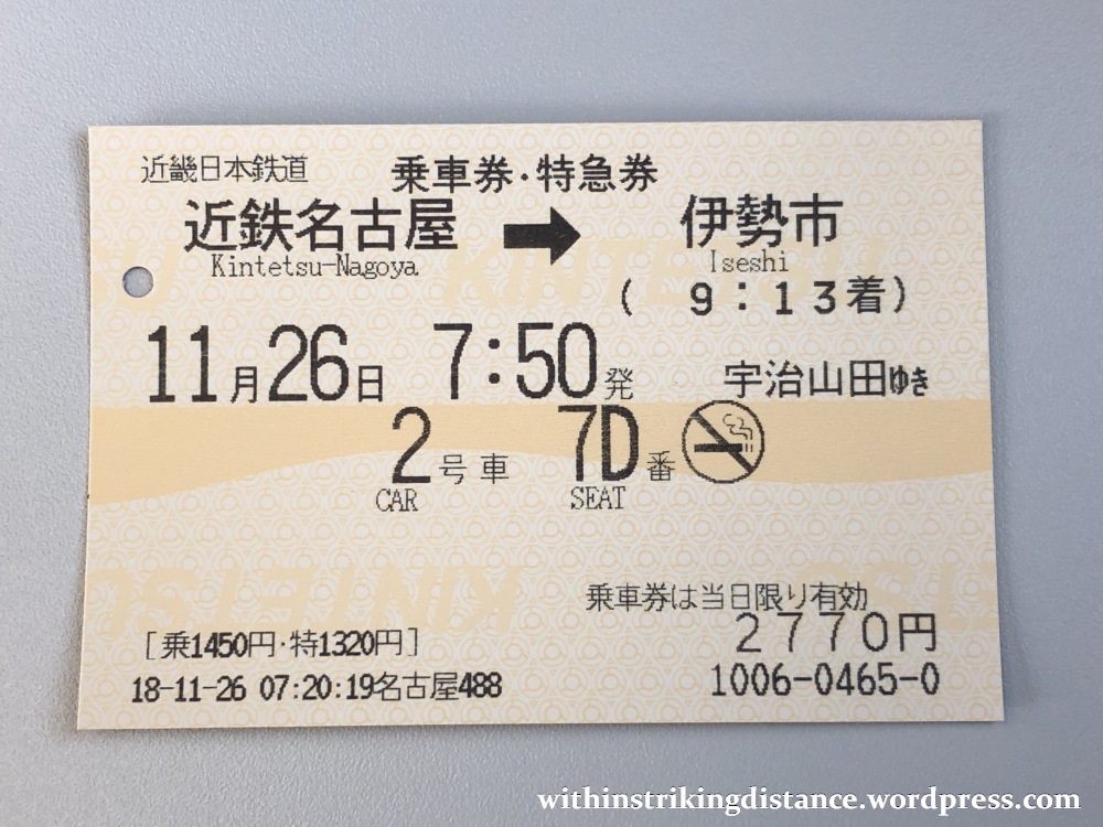 I paid 2,770 yen to ride one of Kintetsu’s limited express services from Nagoya to Ise-shi, with an expected journey time of 83 minutes and no train changes required. Note that Kintetsu is a non-JR company; hence, the Japan Rail Pass is not valid for Kintetsu train services.