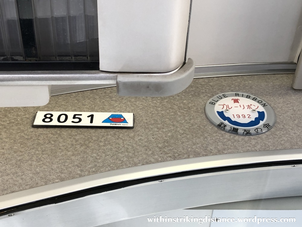 It’s getting on a bit in years, true enough … and the interiors (as we’ll see shortly) aren’t the the most modern you’ll encounter on the Japanese rail network. That said, this train – in its original incarnation as the Odakyū 20000 series EMU – did win the Japan Railfan CLub’s 1992 Blue Ribbon award for outstanding design, as evidenced by the plaque on the right.