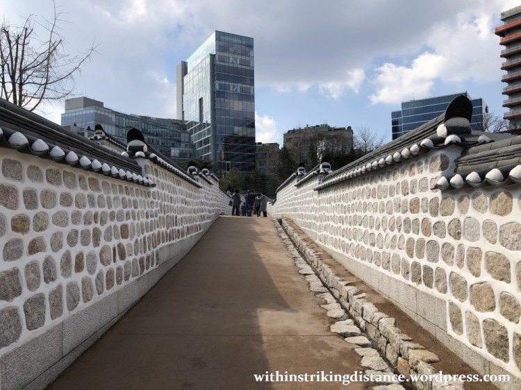 I followed the street until it terminated at a modern, asphalt-paved road. Crossing to the other side, I continued along a sloping detour that took me up to a slightly higher level, but on the same line as the walled street I’d come from on a short while earlier. I suspect the two parts were once joined – perhaps by a natural slope long since cut away – into a continuous route from the Deoksugung compound.
