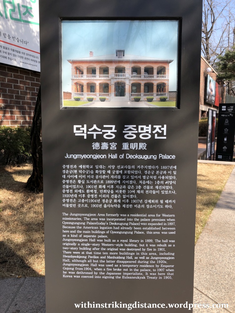 …or at least I would have reentered it, had I gone back in time to the late 19th century when part of this neighbourhood was added to the palace grounds. Within that annexed parcel of land stands Jungmyeongjeon (중명전), the history of which will be told by this well-informed signboard – click to enlarge – since I can’t be bothered to do so myself, haha.