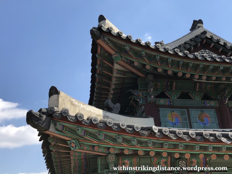 The wooden two-storey main structure of Sueojangdae sits on a raised stone platform. Given one’s normal expectations of rugged, sterile architecture in a martial context, this elaborately decorated building seems more like a royal pavilion than a general’s HQ.