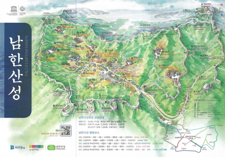 Given my time constraints and preference for an easy stroll, the suggestion was a hybrid trail combining elements of Course 1 and Course 2 (n.b.: I’m using the numbers on the map above). This would allow me to cover a good chunk of Namhansanseong’s northwestern corner and enjoy one of its best viewpoints. I was advised to follow Course 1 north from the town centre to Bukmun (the northern gate), then west and south along the old ramparts as far as Seomun (the western gate) and Sueojangdae (the western command post). But instead of continuing south beyond that point, I’d cut the trail short by heading back east on the downward section of Course 2, ending my visit at Namhansanseong Haenggung (the royal palace near the centre of town).