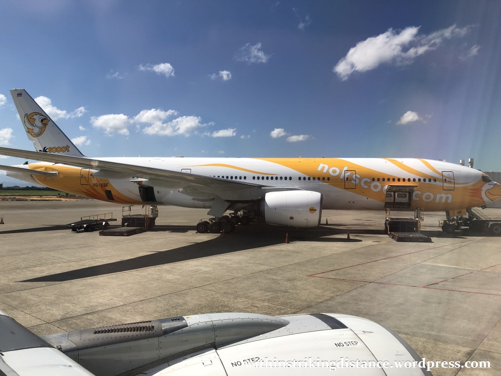 To illustrate what the view is like from this row, here’s a selection of pictures taken through my exit-door window. (Planespotting moment: the aeroplane in the third image below is HS-XBF, an ex-Singapore Airlines Boeing 777-200 currently operated by NokScoot.)