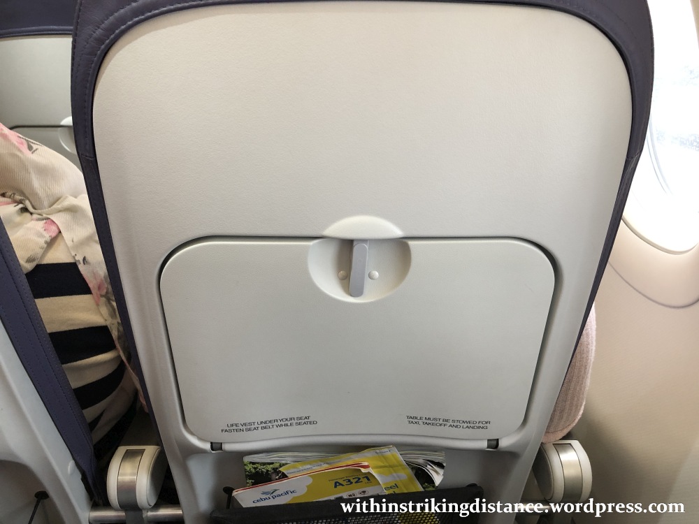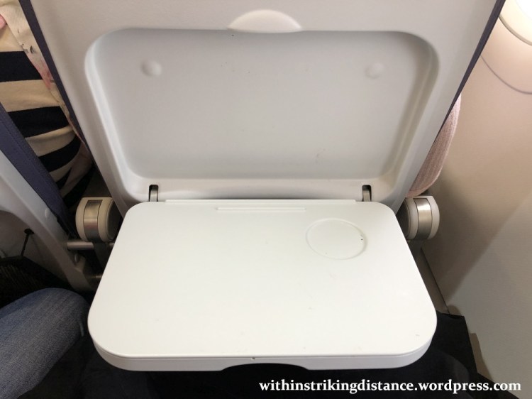 The table might be lacking in size, but it does have an extra feature. Look closely and you’ll observe a small ridge near the back edge – a simple holder for smartphones or small tablets. 5J won’t provide you with built-in IFE, but on their A321 they’ll at least make it easier to enjoy whatever digital entertainment you may have brought on board.