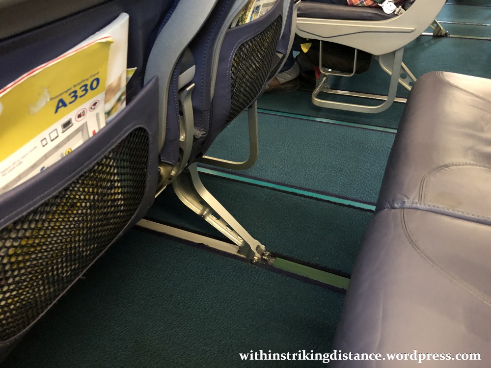 Fitted with a whopping 436 seats in an all-economy layout, 5J’s current-generation A330 should have felt like a sardine tin … except it didn’t. The legroom (as we’ll see in the pictures to follow) was quite adequate for my needs, as was the width and the overall space allocated to my seat. That said, I’m not particularly large in height or width or girth, so I’ll be the first to admit that more generously endowed folk – in one or more of these dimensions – could potentially have found the same seats a very tight squeeze. Depending on one’s personal needs (for which there can be no absolute standard), and with due regard to the fact that 5J are running an LCC (with all the cost-cutting contrivances that this business model entails), one might consider investing more money in an exit row seat if additional space is desired.