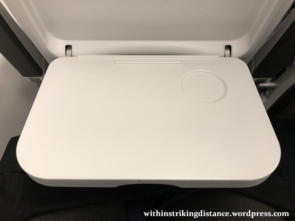 Here’s the tray table. Typical fold-down plastic surface for the most part … but observe the little ridge near the back edge.