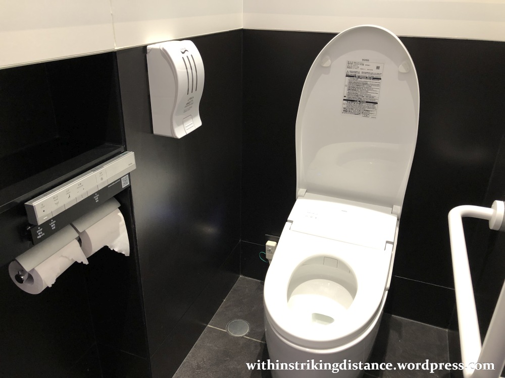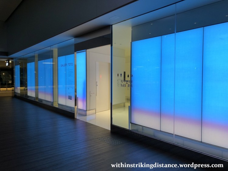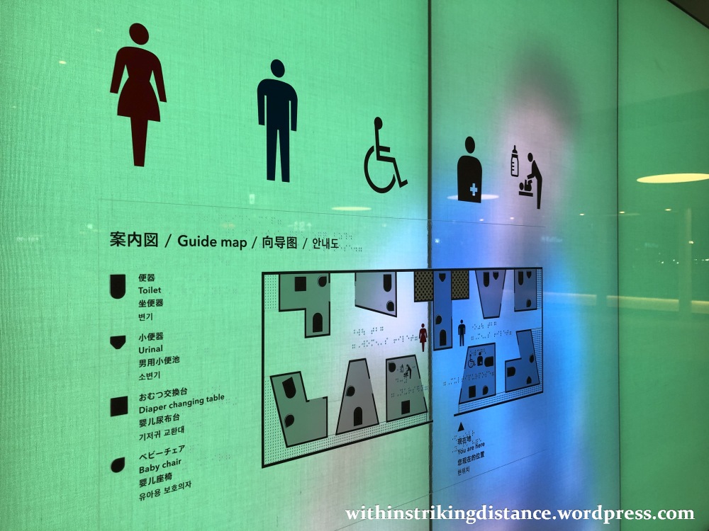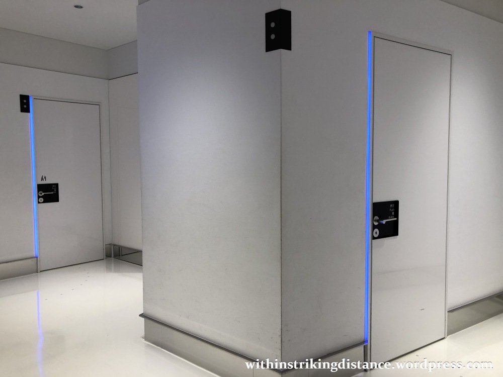 Note the strip of light next to each door. It glows blue if a cubicle is unoccupied (or perhaps if you’ve forgotten to engage the lock?), but the illumination shrinks to a small red bar near the bottom once you seal yourself inside. Now I didn’t linger long enough in any of the booths to notice it myself, but I’ve read that the red glow will gradually rise towards the top the longer you stay inside. Useful for people waiting outside, as a fully red bar might suggest that the person within has been ruling on the throne for quite some time and that their, er, reign of darkness will shortly draw to a close. (And if it does not, simply lay siege to the door and overthrow them by force.)