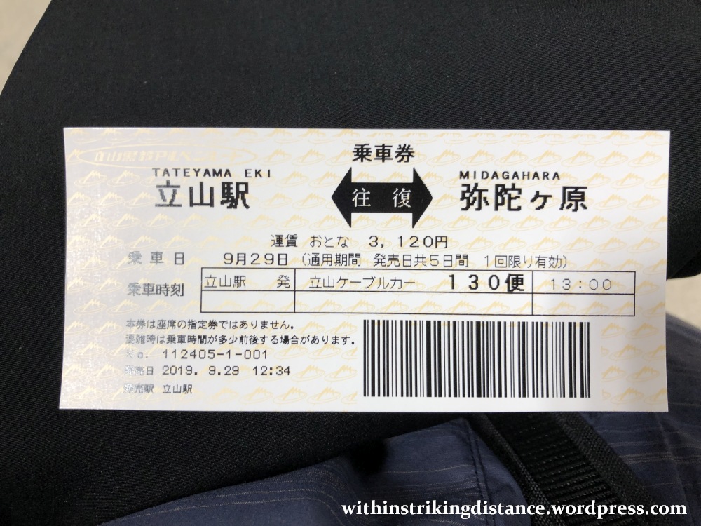 And here’s mine, issued for the 13:00 cable car service and valid for a round trip between Tateyama and Midagahara (including both the cable car and subsequent bus ride). I paid 3,120 yen at the time, but note that this was just two days before an increase in Japan’s consumption tax – from 8% to 10% – took effect nationwide. As of this writing, a round-trip fare to Midagahara costs 3,170 yen.