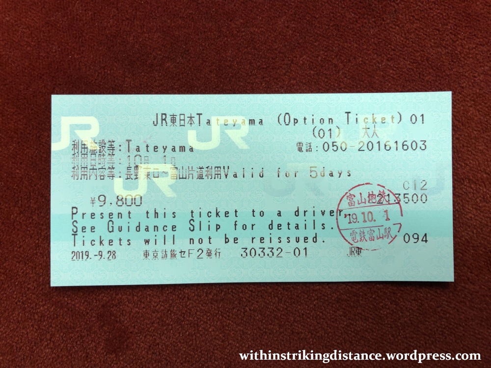 For my part, I purchased a Tateyama Kurobe Option Ticket at the JR East Travel Service Centre in Tōkyō Station, several days ahead of my planned date of use. That’s the little green card you’ll see in some of the pictures below – and in the course of this journey, I’ll demonstrate how I made use of it. Hereinafter, to keep things brief, I’ll refer to it simply as the “Option Ticket”.