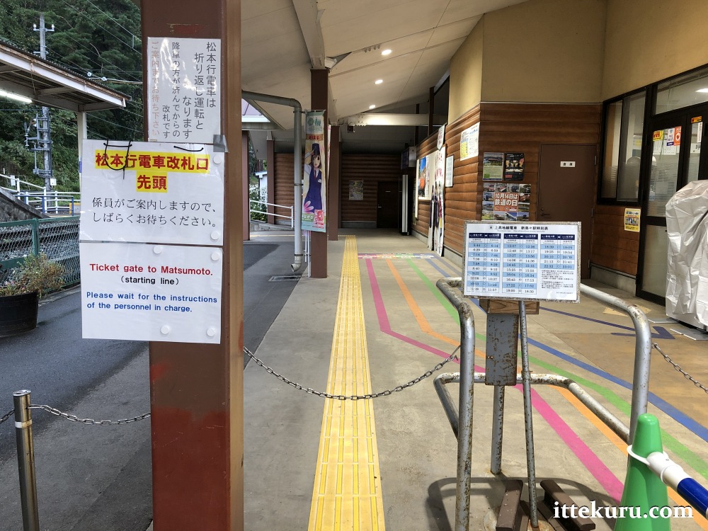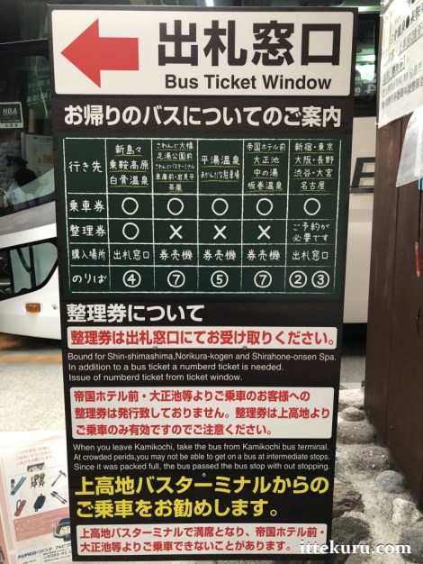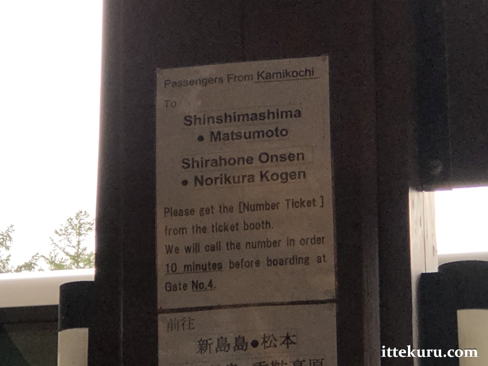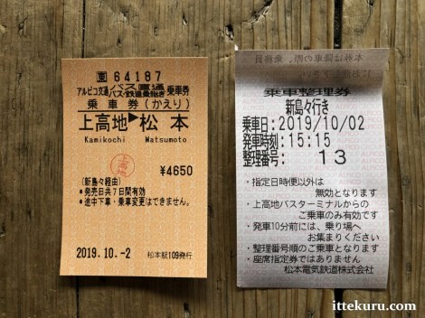 As mentioned earlier, seat reservations aren’t necessary – or even possible – for the local buses/trains plying the Matsumoto-Kamikōchi (via Shin-Shimashima) route. In order to control outbound boarding, there’s a special queuing system in place where passengers need to request a numbered ticket (整理券, seiriken) from the counter in addition to a paid fare ticket (乗車券, jōshaken). Numbered tickets are free of charge and are issued per departure schedule; simply tell the counter staff which bus you’d like to board or what time you’d like to leave.