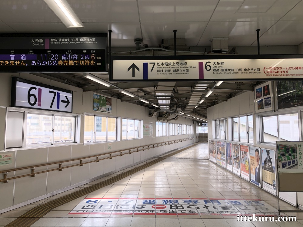 The station’s fare-paid zone is shared by the East Japan Railway Company (JR East) and Alpico Kōtsū (Alpico). The central section (consisting of tracks 0-5) is used by JR East trains. Tracks 6 (JR East) and 7 (Alpico) are located on a somewhat isolated platform at the station’s western edge, accessible through a covered walkway.