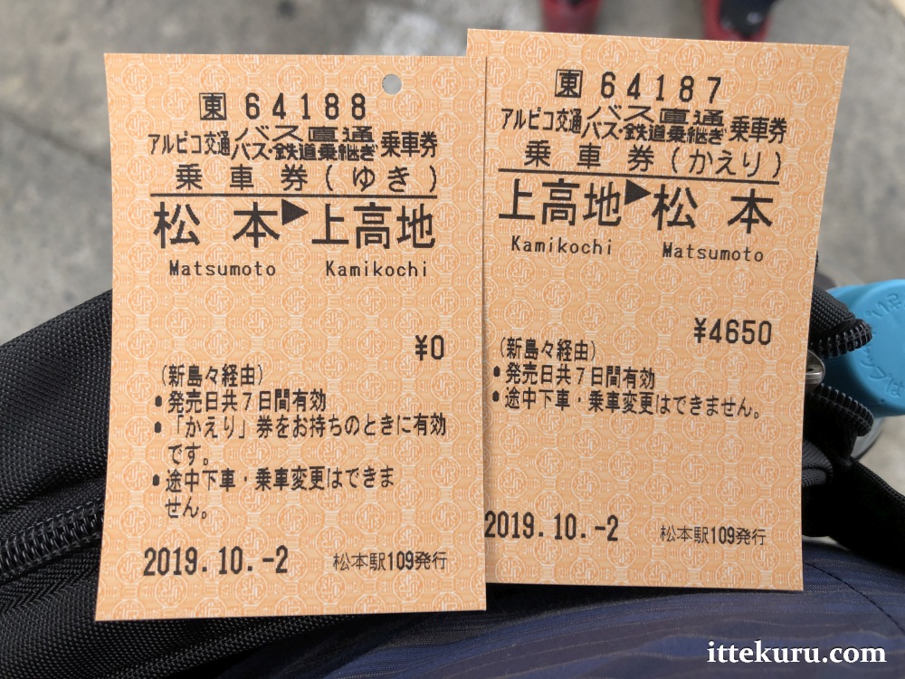 I used a vending machine and paid 4,650 yen for round-trip passage between Matsumoto and Kamikōchi (picture below). The machine issued two tickets for this transaction: one outbound (ゆき, yuki) from Matsumoto to Kamikōchi, and one return (かえり, kaeri) from Kamikōchi to Matsumoto. Each ticket was valid for both the train and bus segments of its own leg.