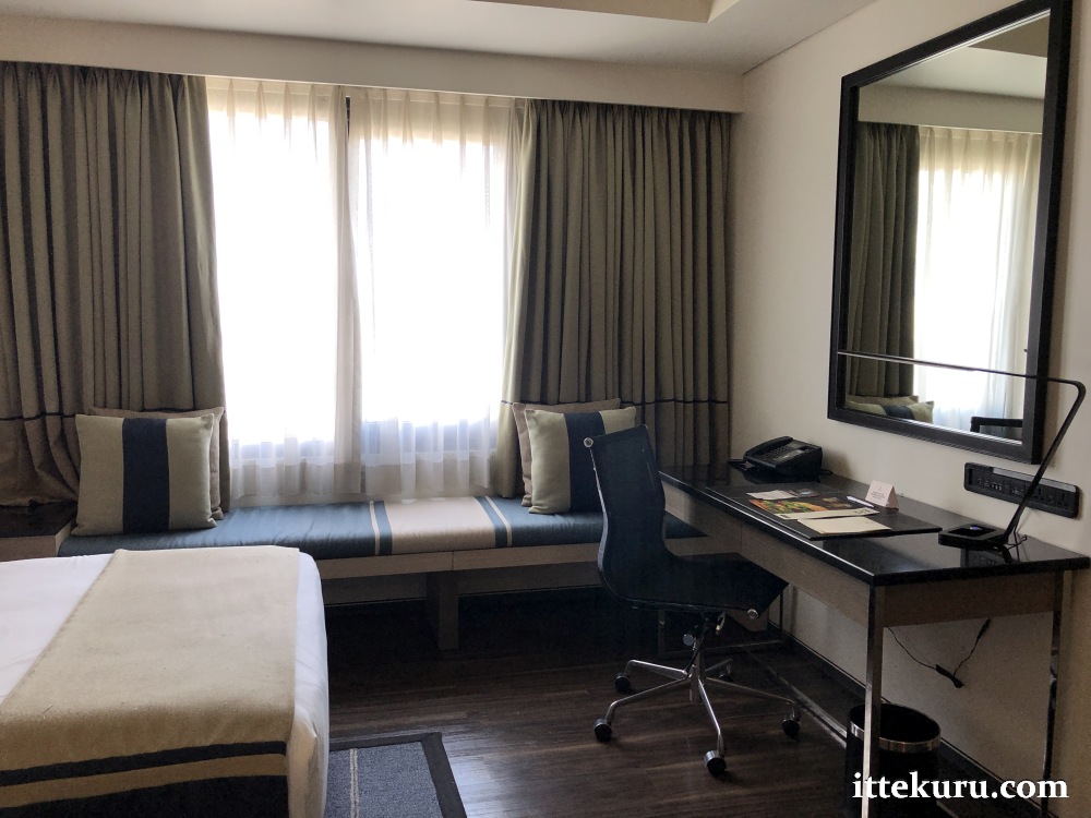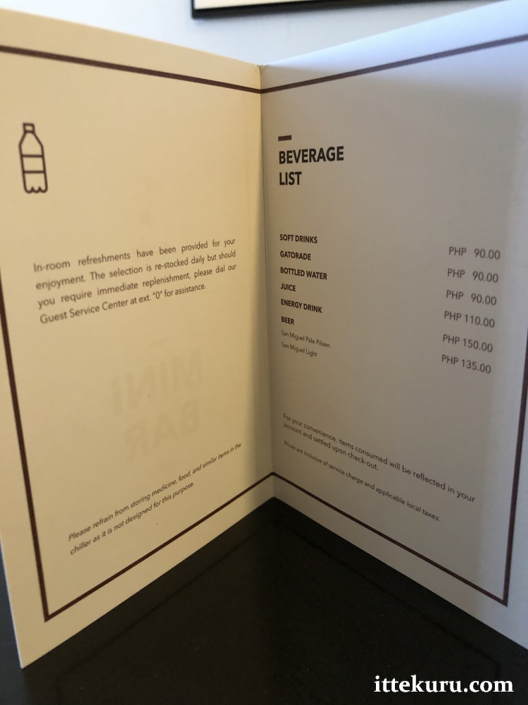 Here we have a twin guest room, which I suspect is all but identical to the hotel’s doubles (with the beds reconfigured). Quite spacious and well lit from the east-facing window. It helps that the Serendra residential property across the street is of a lower height, allowing natural light to flood in unimpeded.