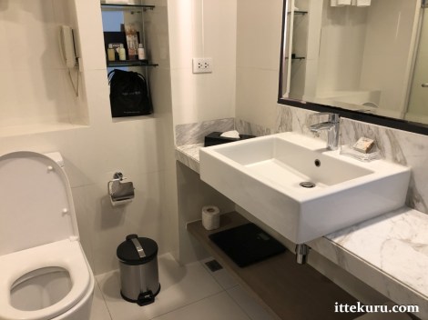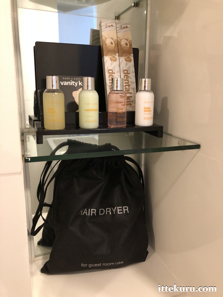 Here’s the bathroom and its glass-screened shower stall. Normal amenities for the most part: bottled toiletries, dental hygiene kits, hair dryer, etc.