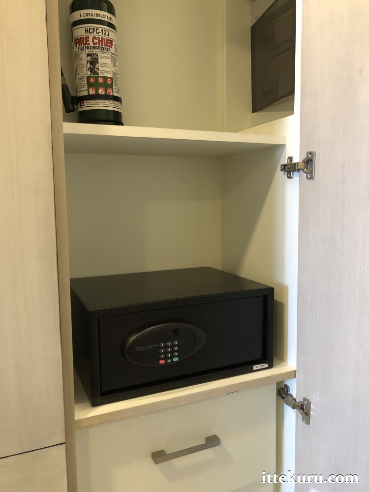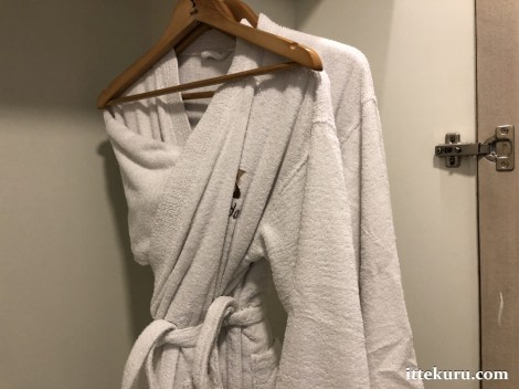 Let’s take a peek in the closets now. Just the usual suspects: in-room safe, bathrobes, slippers and so on. (Plus a fire extinguisher … you know, just in case.)