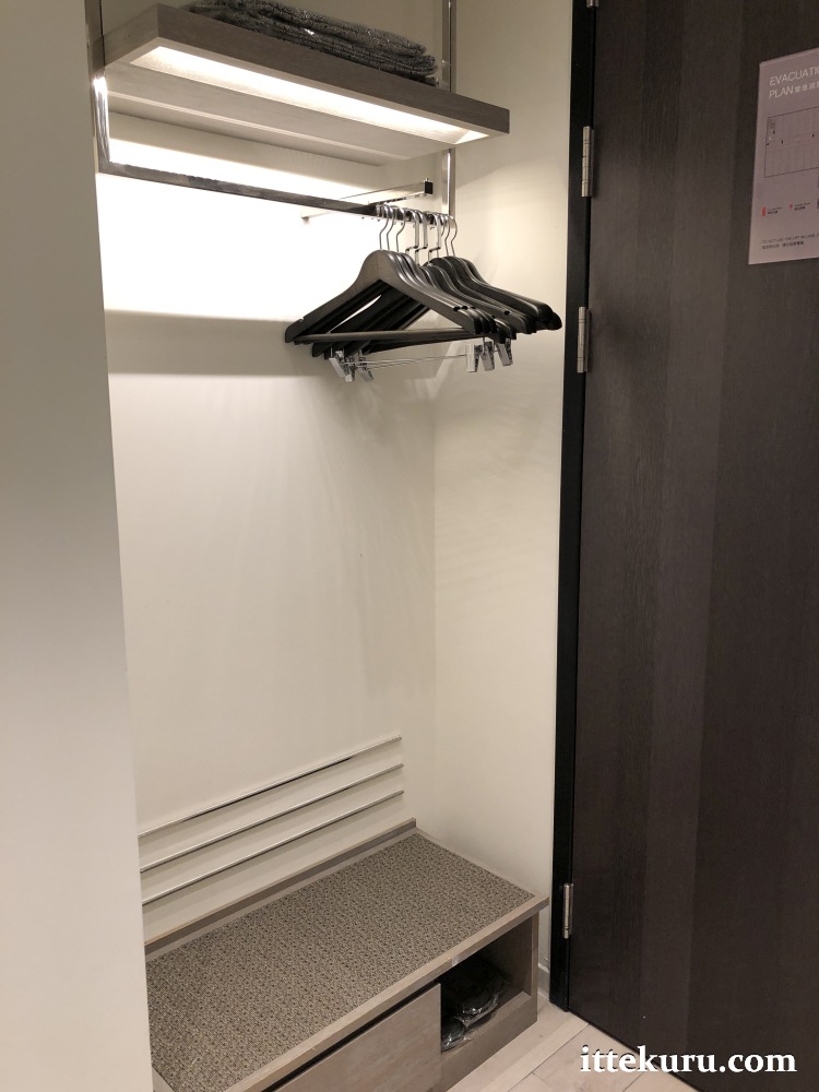 Just inside the entrance-way was a bit of closet space – though lacking a door, it couldn’t really be called a proper closet. We found room slippers stashed in a small opening near the floor, with robes stowed neatly up on the shelf above the hangers.