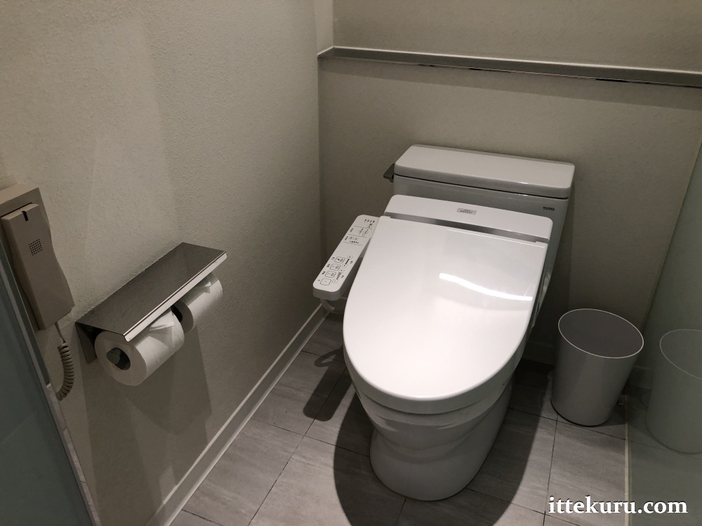 Finally, there’s the toilet in a separate cubicle one door down (closer to the room entrance). Japanese-style built-in bidet with push-button controls.
