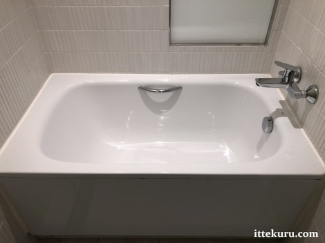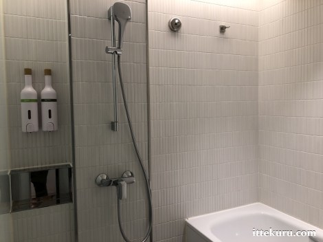 The shower and bathtub were in one compartment, next to the sleeping area. Note that the shower’s been fitted above the tiled floor – not over the tub – so expect the room to get wet every time someone washes down.