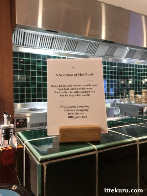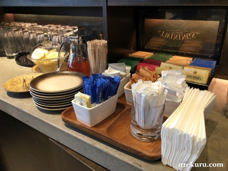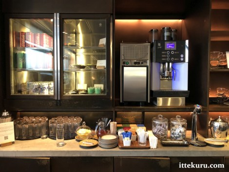 Facing the main section of the dining area is a sideboard stocked with beverages and light snacks. The cookie jars here (plus a couple of finger-food trays on the Noodle Bar) are pretty much the only self-service element of the dining area, at least where solid food is concerned; you won’t find chafing dishes or open bread baskets or anything of that sort.