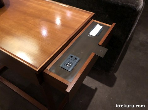 Charging points are available for those who need to top up their device batteries. For example, if you’re next to a side table, you’ll find power outlets concealed in the drawer.
