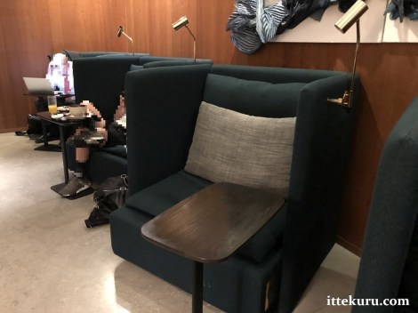 If you’ve settled into one of the large solo chairs, you’ll find a charging point down by your feet (mounted on the side). Note that the small table in the picture below isn’t fixed to the floor, so you can move it into whatever position suits your needs.