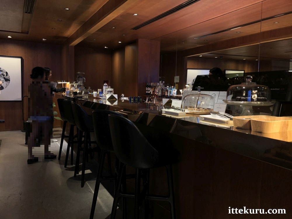 Off to one side of the main area – in a separate room but open to the rest of the lounge – is the bar. A more intimate and potentially quieter setting, though that of course depends on how well-behaved the clientele of the day is! I didn’t take pictures of the seating in front of the bar, but you’ll find chairs and tables in addition to the counter seats shown below. (We’ll come back here in due course and explore what’s available on the drinks menu.)