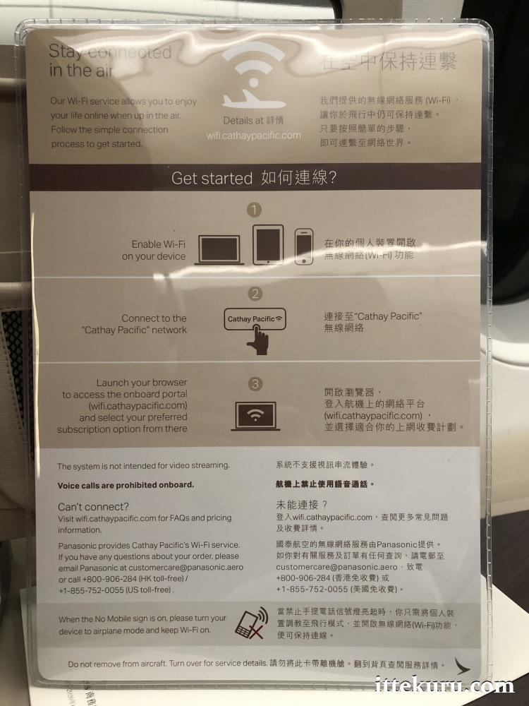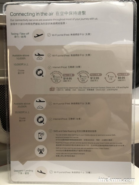 To close things off here, let’s take a look at the sheet that gives details about the onboard WiFi and connectivity features. This is available on CX’s newer (or newly-refitted) aircraft, and might be of use to passengers who need to stay in contact whilst in the air. Note that the service is not complimentary and voice calls are prohibited.